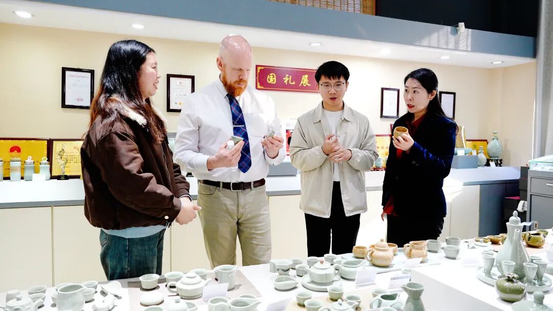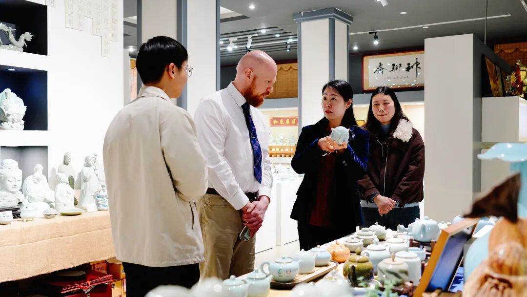 当日下午,在薛佳乐的陪同下,安德鲁·纽厄尔一行来到汝州职业技术学院大学生校外实践教育基地、河南省陶瓷文化和非遗传承国情教育基地以及廷怀窑,通过实地参观、深入交流,精准对接行业需求,探索陶瓷行业人才培养新模式,为英国格拉斯格城市学院与汝州职业技术学院间的合作办学高质量开展奠定基础。